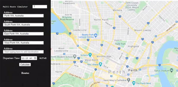 Another HTML/JS/CSS project involved producing a multi-route real-time logistic tracker. The default https://www.google.com/maps does not function with multiple separate routes, nor does it simulate the drive in real time. Utilising Google’s Maps/Routes/Places API, the tool was able to simulate idealised live movement (and adjust in real time) of estimated routes and return accurate arrival times with custom delays.
